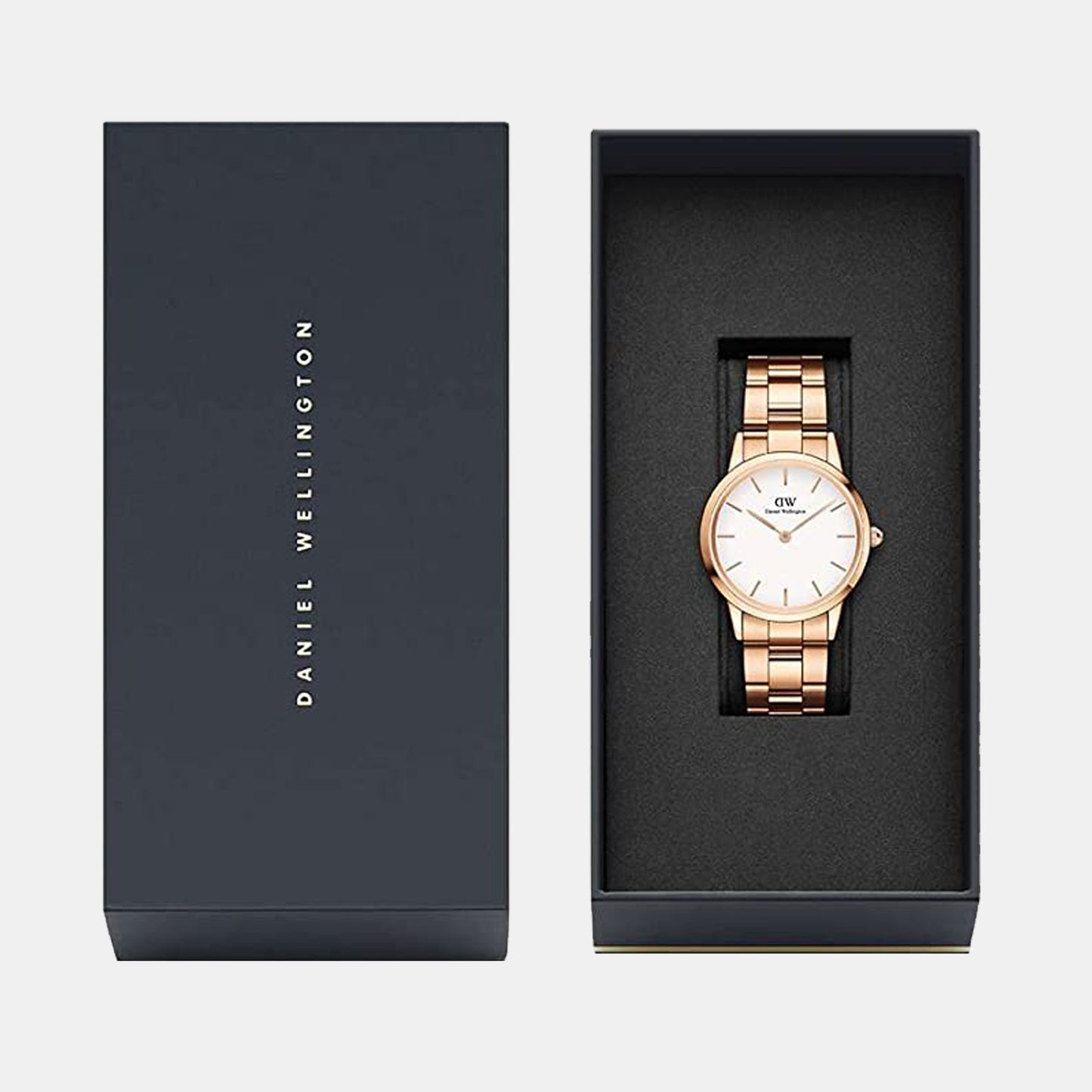Discover Daniel Wellington watch for women, featuring a white dial, a rose gold strap made of stainless steel in a round case. Built with mineral glass and stainless steel body to balance clarity and durability. Dimensions include 28 mm dial size, 14 mm strap width, 8 mm profile for comfortable wear. Key features: quartz movement, analog display, 3 atm water resistance. A secure butterfly clasp ensures a dependable fit.