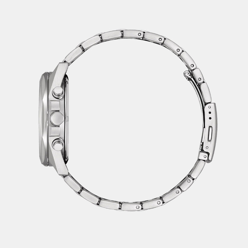 Striking a perfect balance between functionality and elegance, the new Eco-Drive Chronograph watch is designed for the man with a keen sense of style and a demand for precision. The classic 41mm stainless steel case and bracelet exude a timeless charm, while the silver-white dial provides a crisp and clean backdrop for the black subdials, reminiscent of the sophisticated instrumentation of vintage sports cars. The watch's Eco-Drive light-powered movement highlights CITIZEN‘s innovative approach to sustainable watchmaking, drawing power from any light source to offer a remarkable 9-month power reserve. This ensures uninterrupted performance without the need for battery changes, aligning with eco-conscious values.Its chronograph functionality is precise to 1/5 of a second and can record up to 60 minutes of elapsed time, making it an indispensable tool for timing everyday tasks or sporting events. Alongside this, the watch features a 24-hour display and a date function, both of which add layers of utility to its stylish facade.Protected by mineral glass and water-resistant up to 10 bar, this watch is built to endure the rigors of daily life. The fold-over clasp with a push button guarantees a secure and comfortable fit, ensuring the watch remains a constant companion, whether in a business meeting or on the racetrack.CITIZEN's commitment to excellence and innovation is evident in this watch, which offers not just a way to tell time but a sophisticated accessory for those who value reliability and style