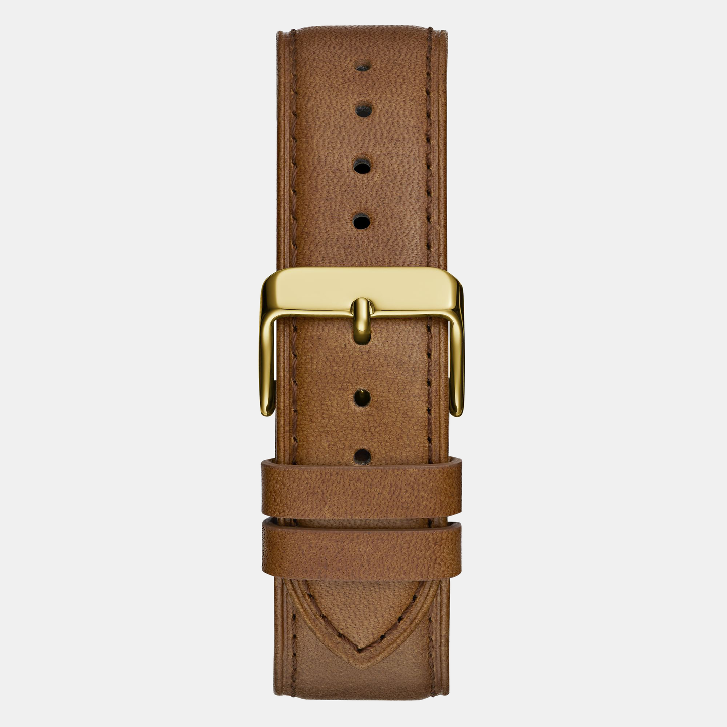 Add a stylish dimension to your look by wearing this men's analog watch from the collection by GUESS. Thewhite round dial is protected by a mineral glass. It features and a crown for time adjustment. The stainless steel strap comes in a brown hue that further elevates the look of the timekeeper. Besides, it is completed with a strap buckle clasp to ensure a secure fit on the wrist.