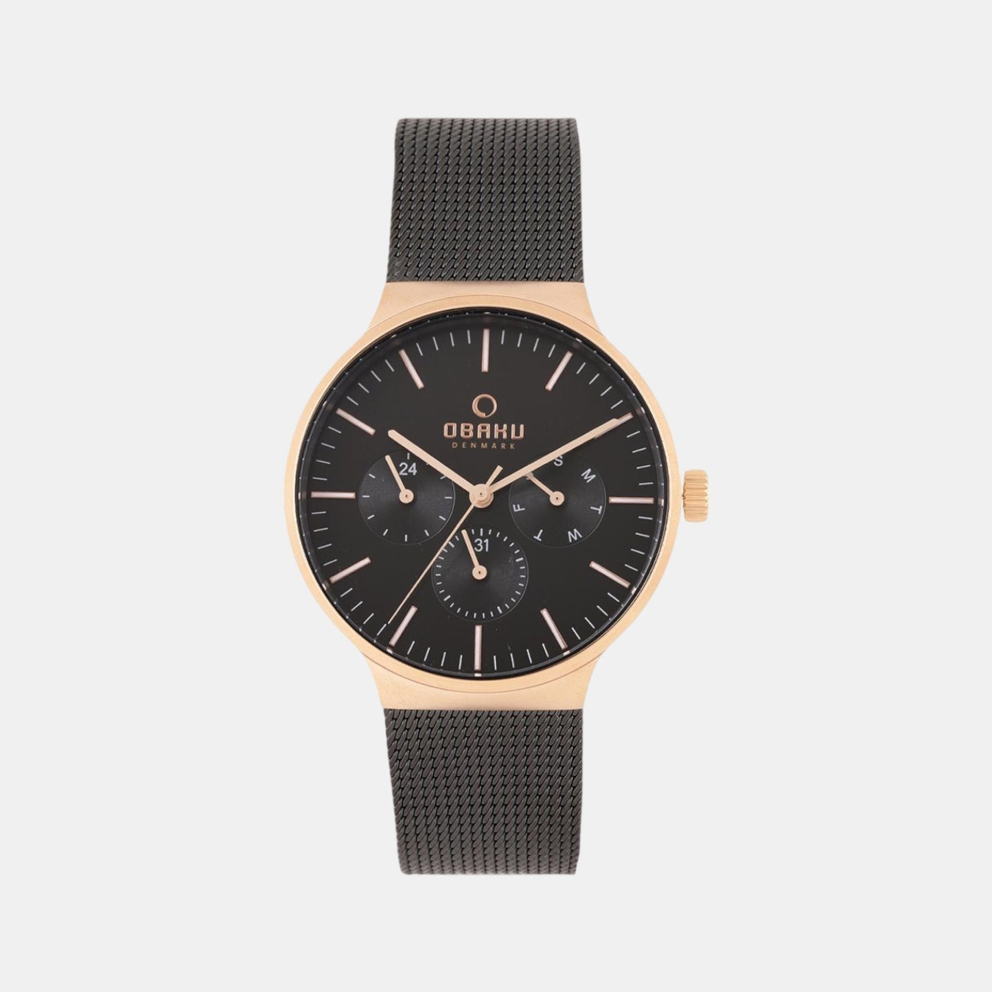 Discover Obaku watch for men, featuring a black dial, a black strap made of stainless steel in a round case. Built with mineral glass and stainless steel body to balance clarity and durability. Dimensions include 43 mm dial size, 22 mm strap width, 6 mm profile for comfortable wear. Key features: quartz movement, analog display, 5 atm water resistance. A secure push-button deployment ensures a dependable fit.
