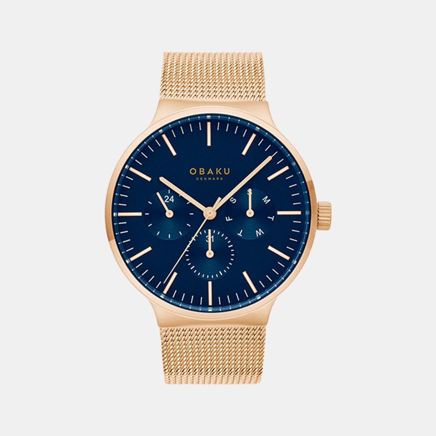 Discover Obaku watch for men, featuring a blue dial, a rose gold strap made of stainless steel in a round case. Built with mineral glass and stainless steel body to balance clarity and durability. Dimensions include 41 mm dial size, 22 mm strap width, 10 mm profile for comfortable wear. Key features: quartz movement, analog display, 5 atm water resistance. A secure push-button deployment ensures a dependable fit.
