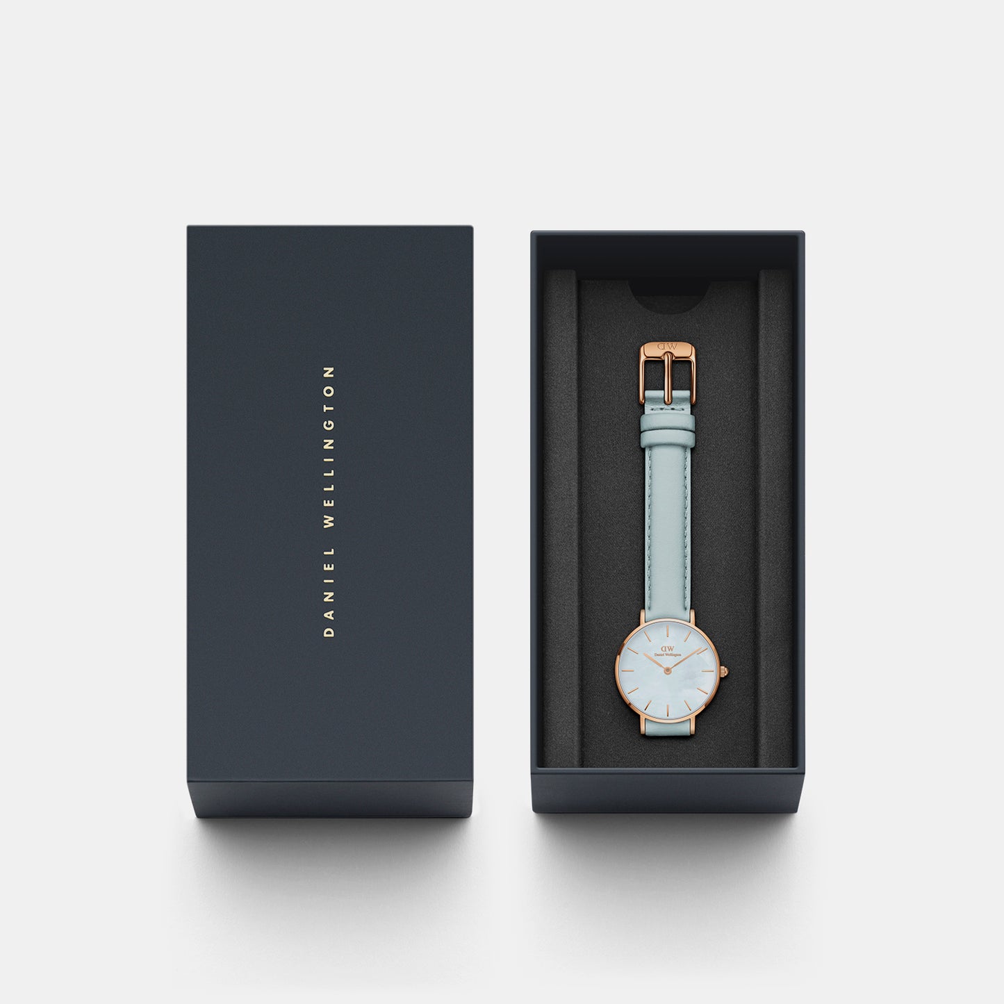 Discover Daniel Wellington watch for women, featuring a blue dial, a blue strap made of leather in a round case. Built with mineral glass and stainless steel body to balance clarity and durability. Dimensions include 28 mm dial size, 6 mm profile for comfortable wear. Key features: quartz movement, analog display, 3 atm water resistance. A secure pin buckle ensures a dependable fit.