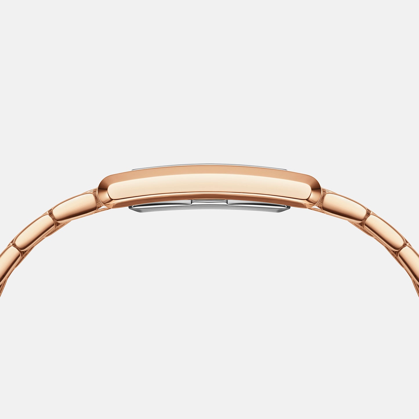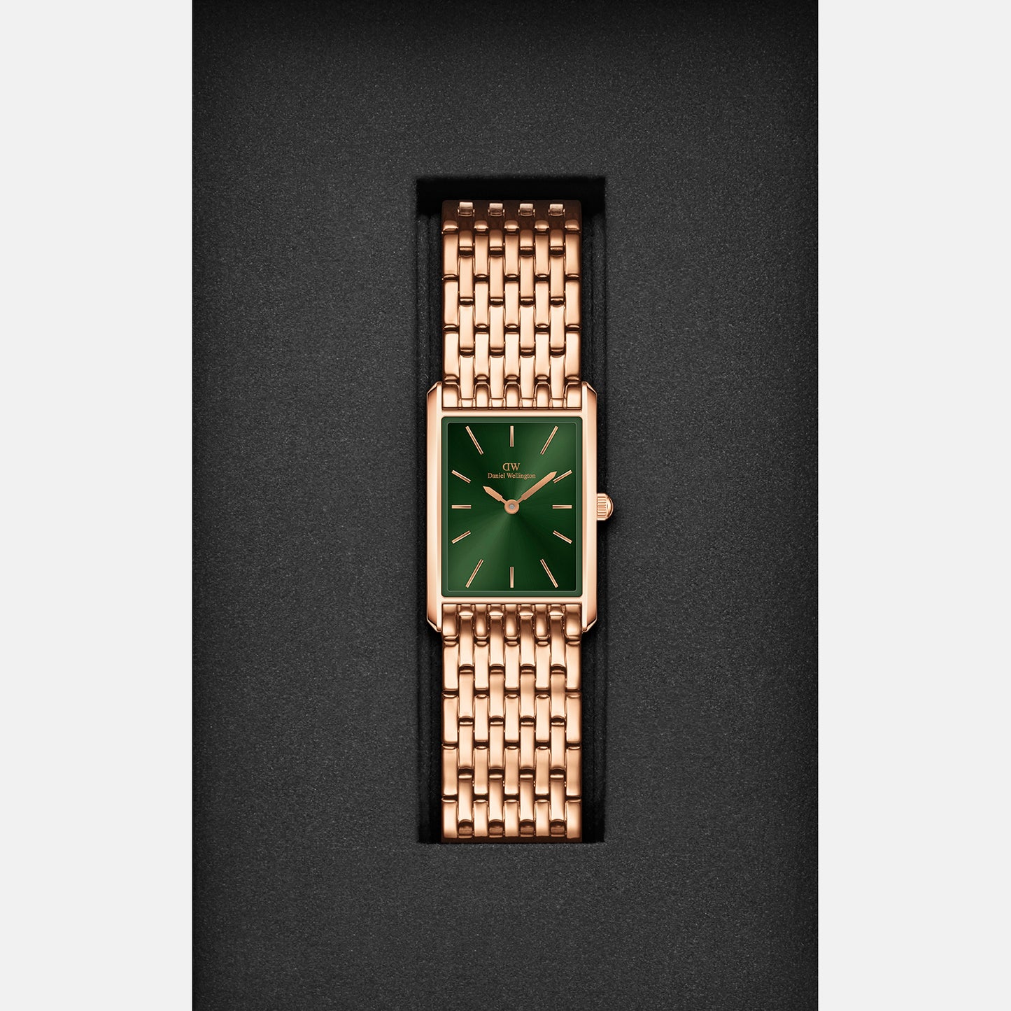With sleek geometric edges and two sizes to choose from, our Bound collection brings perfect symmetry to your wrist. The curved rectangular case of this rose gold watch matches the exact width of its 9-link strap—giving you a seamlessly integrated emerald sunray dial.