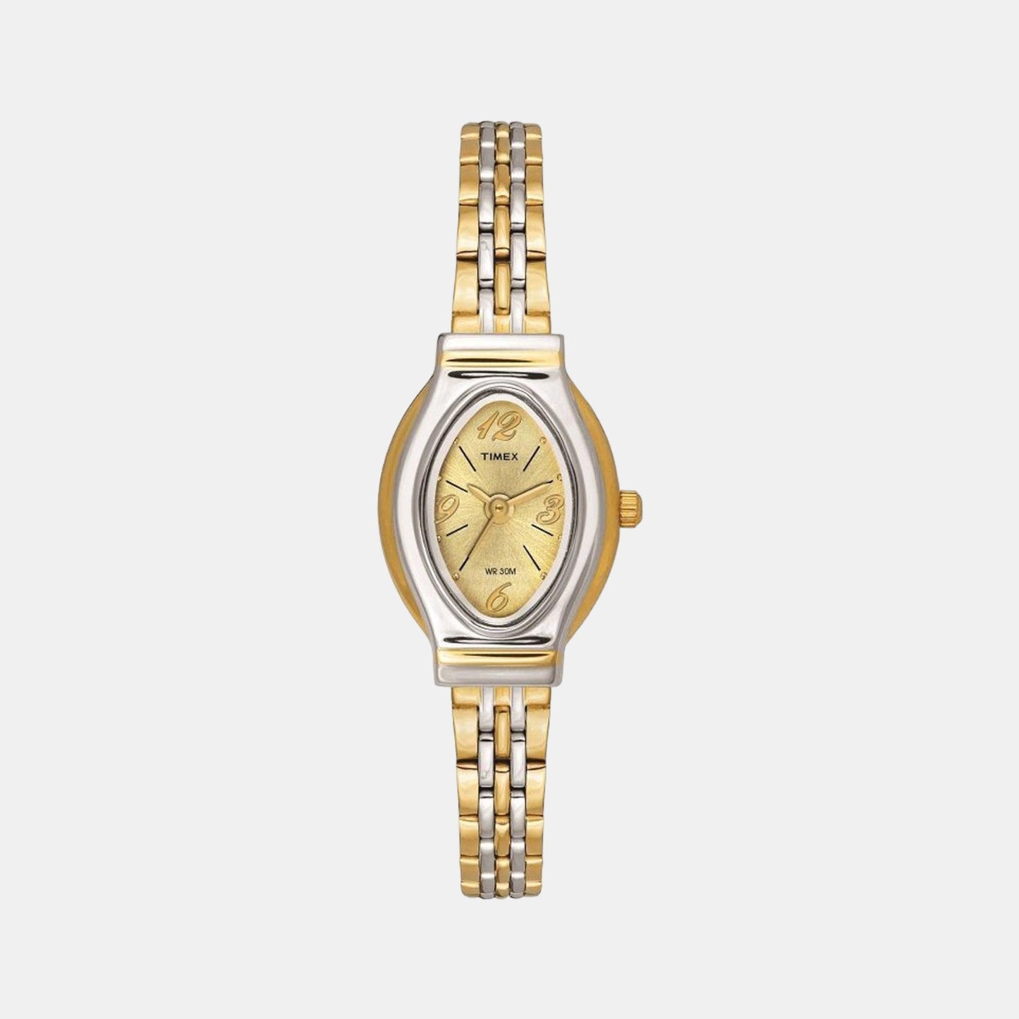 Get hold of this stylish women's analog watch from the Classics collection by Timex and make a distinct style statement. Secured by a mineral glass, the silver oval dial is housed in a 19 mm case. It exhibits plain three hands, numeral markings at quarter intervals, bold stick indices for rest of the hours and a crown for time adjustment. The stainless steel strap showcases a golden hue that uplifts the look of the watch.