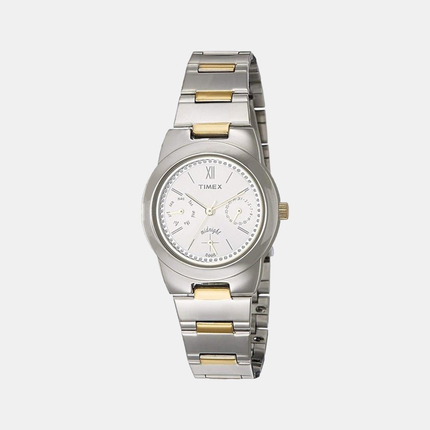If you are a watch aficionado you will surely love this women's analog watch from Timex. Operated by a quartz movement, the white round dial features plain three hands, bold stick indices at five-minute intervals, three subdials, stone studded detailing and a crown for time adjustment. The stainless steel strap flaunts an elegant silver hue that accentuates the look of the watch. Moreover, it is completed with a push-button clasp to ensure a secure fit on the wrist.