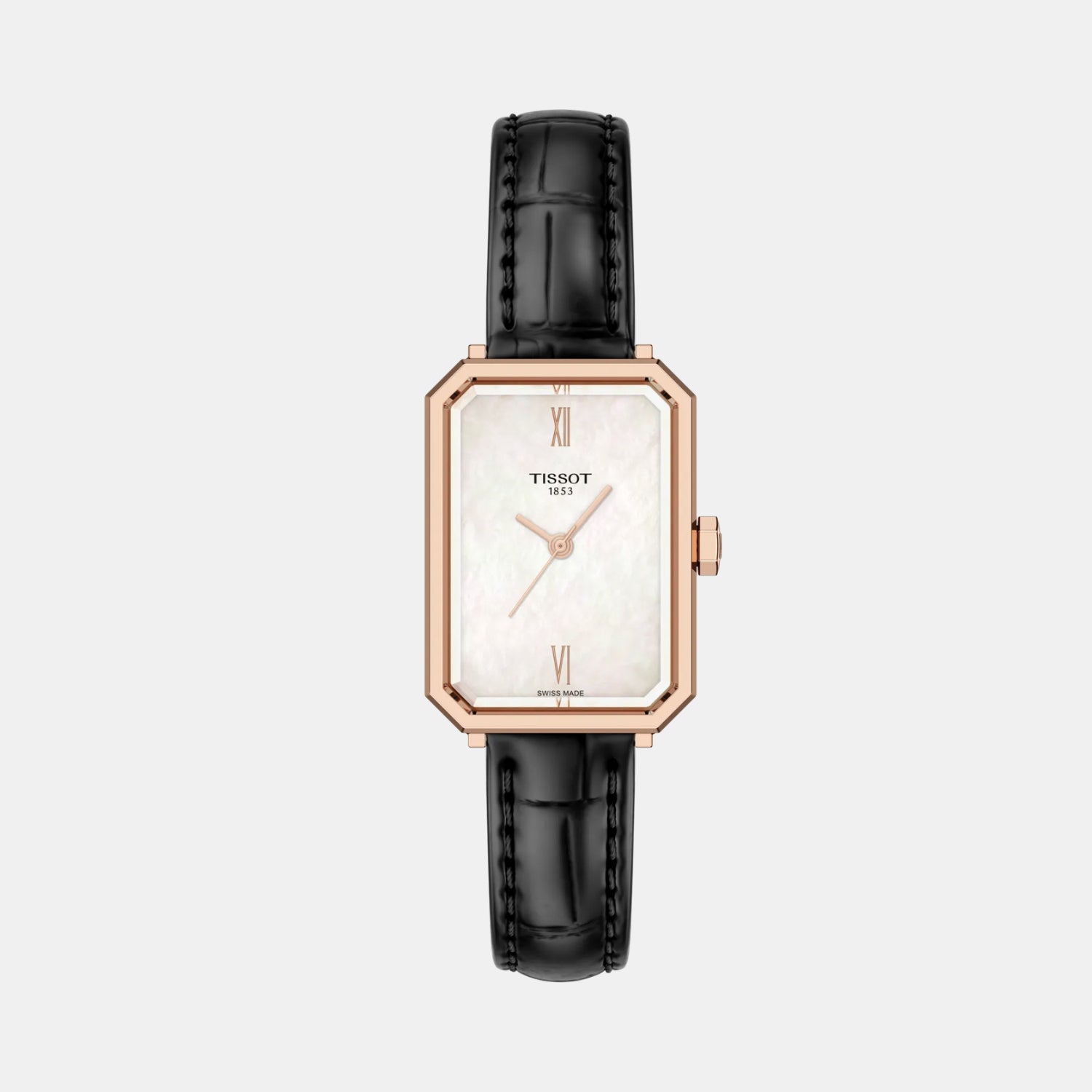 Crafted by Tissot, this elegant timepiece from the SRV collection exemplifies refined design. It is tailored for Women, featuring a Rectangular case shape for timeless appeal. The Leather strap adds strength and sophistication. With a dial size of 30 mm, it balances subtlety and presence on the wrist. The strap width of 12 mm complements its sleek profile. The 7.25 mm case thickness ensures a lightweight feel. A White Mother Of Pearl dial and Black strap create a distinct contrast. The Pin Buckle buckle secures comfort. Driven by Quartz movement, it delivers precision through Analog display. Protected by Sapphire Glass and Stainless Steel dial material. It offers 5 ATM water resistance.