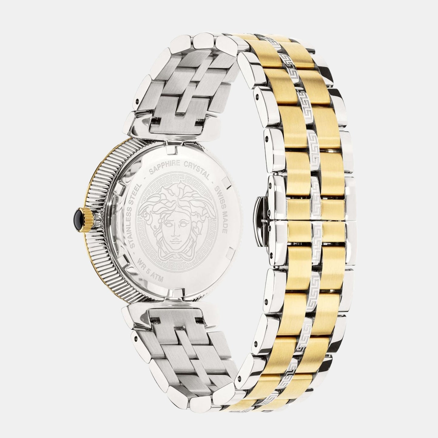 Both practical and decorative, this Ronda 762 Swiss quartz watch with two hand movement and with a 36 mm dial features a Medusa head and Versace logo at the 12h position surrounded by the signature Greca pattern. The Greca icon is a decoration all over across the bracelet as well as all around the top ring and on the dial. Enriched with details such as the wonderful guilloche in the dial and the Greca and Versace logo on the right, this watch is extremely evergreen and incredibly feminine.
