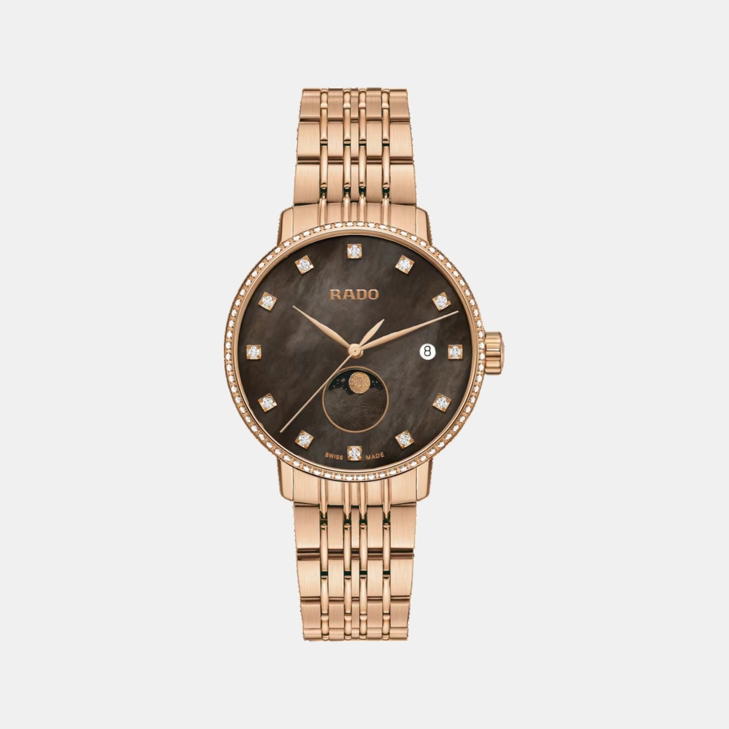 The unique DiaStar Original has a diameter of 38 mm and is water resistant down to 100 m. Framed by an ultra-shiny yellow gold couloured Ceramos™ coiffe with polished angles and detailing set over a matching, yellow gold couloured PVD coated stainless-steel case, this beautiful watch is rounded off with a parallel-stripe-faceted sapphire crystal. Specifications include a gold brushed dial with two directions, yellow gold coloured hands with white Super-LumiNova®, and a white day date display. The dial features eleven full cut diamonds, emphasised with the dark grey coloured printed “jubilé” logo. The Rado R764 automatic movement offers 80 hours of power reserve, with an antimagnetic Nivachron™ balance spring. The bracelet is made of yellow gold PVD coated polished and brushed stainless steel.