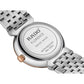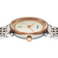 Experience the harmonious blend of artistic expression and design stylings with the Rado Centrix Open Heart watch. As the constellations write their eternal stories above our heads, they build bridges for lovers to meet. A large window, reminiscent at once of dawn and dusk, beautifully frames a state-of-the-art R734 automatic movement with 80 hours of power reserve and an antimagnetic NivachronTM hairspring, as well as a deeply elegant rippled-sunlight "ondulé soleil" motif on chosen component surfaces. The overall appearance of this iconic timepiece is completed with adjusted case lugs and a bracelet made of polished rose-gold-coloured PVD-coated stainless steel with plasma high-tech ceramic middle links. The light silver mother-of-pearl dial with 12 diamonds, emphasised with the rose gold coloured printed “jubilé” logo, matches perfectly with the hands. The watch is water resistant down to 50 m and is also available in L size.