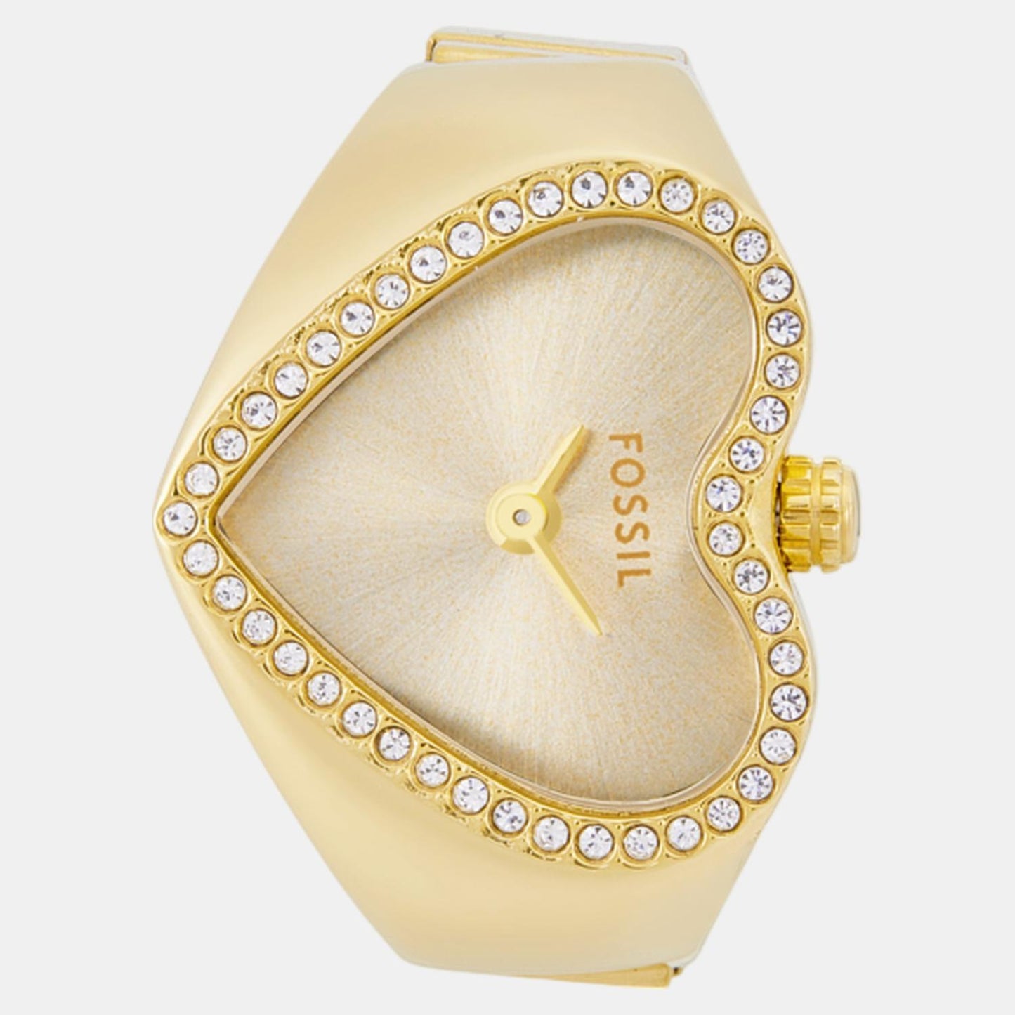 Reinvent your jewelry game with this sleek and stylish heart watch ring. Crafted from lustrous gold-tone stainless steel with dazzling crystal accents, it balances timeless sophistication with modern flair. The vibrant gold sunray dial adds a radiant touch, while the flexible band to fits any finger. Slip it on for an effortless accent that elevates any look.