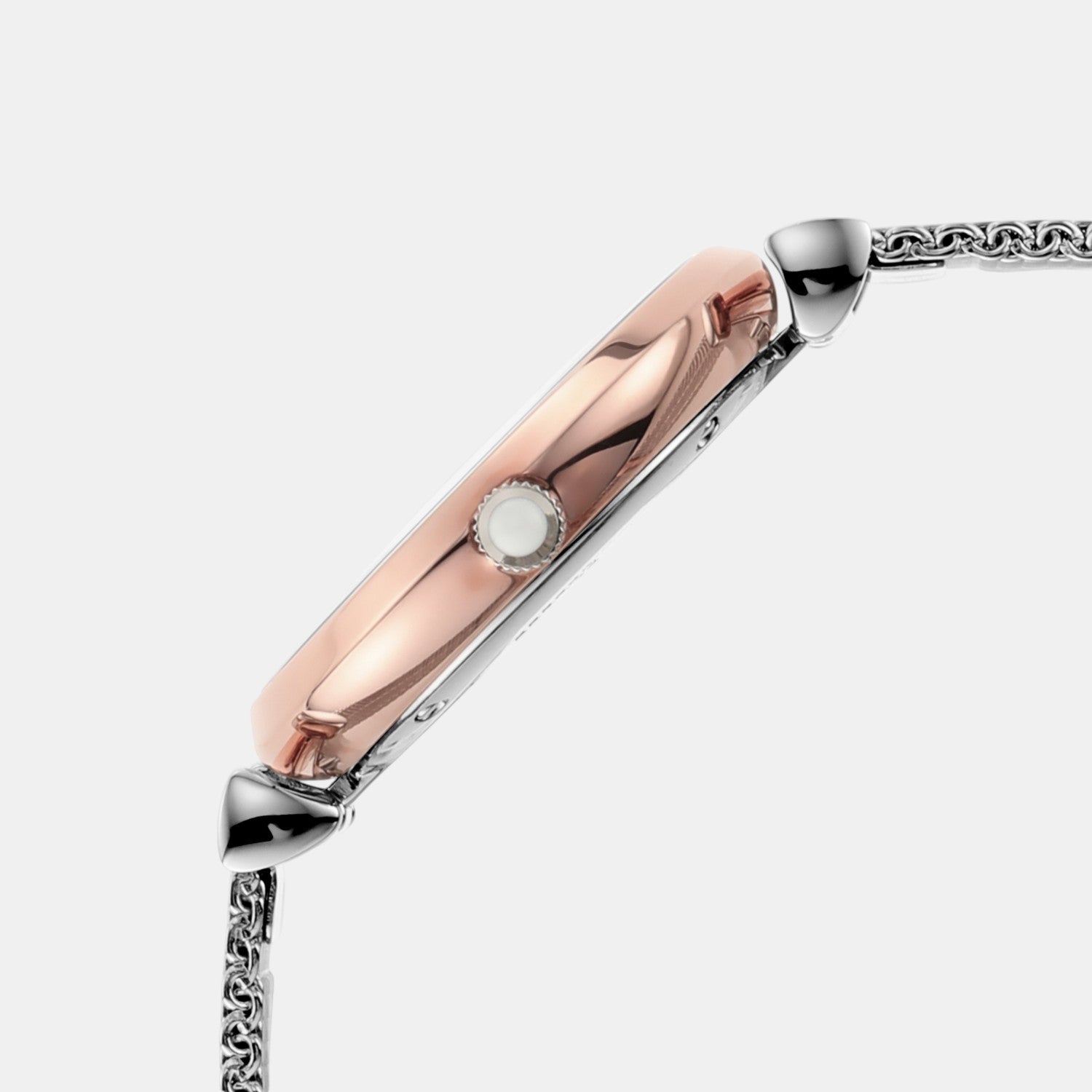 The sleek stainless-steel mesh bracelet of this Emporio Armani ladies' watch keeps the focus on the glossy white mother-of-pearl dial and two-tone case. The dial is accented with rose gold-tone Roman numeral and stick indexes.